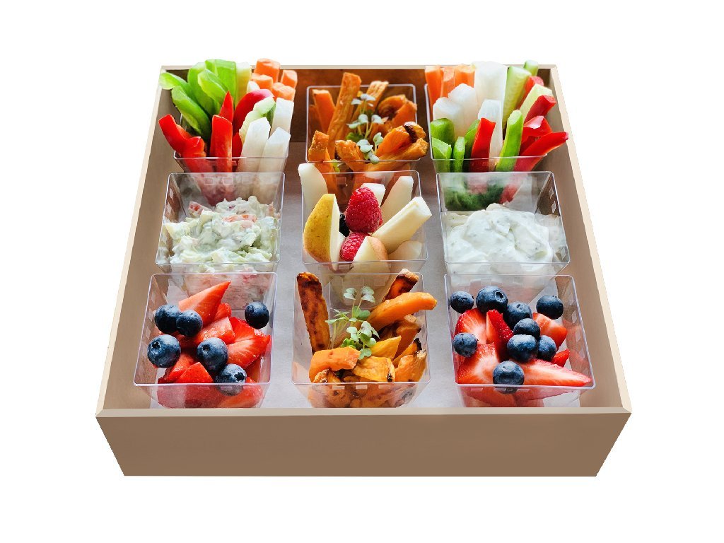 - 2 kelímky se zeleninovými hranolky z mrkve, celeru a okurky, papriky, ředkve,