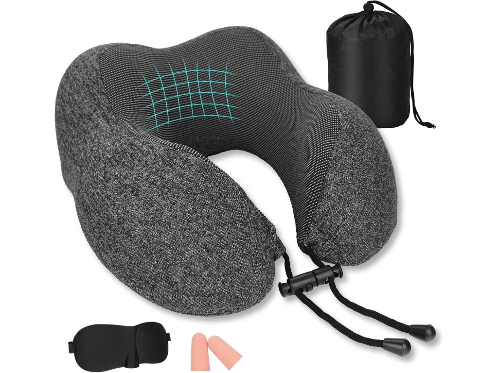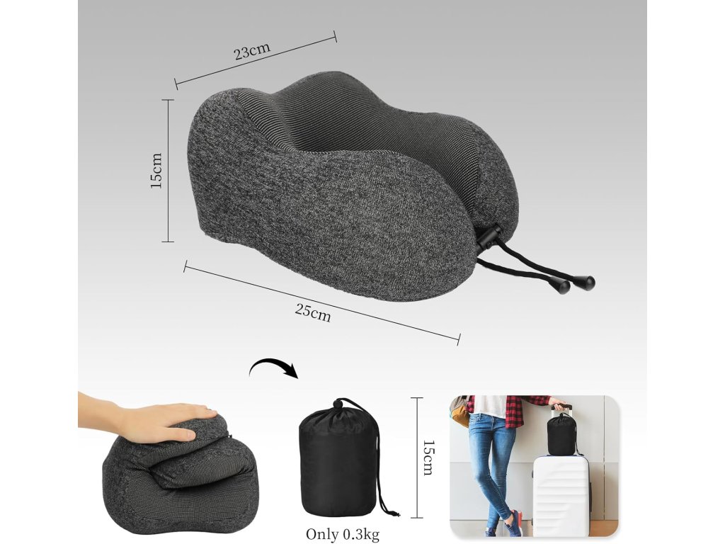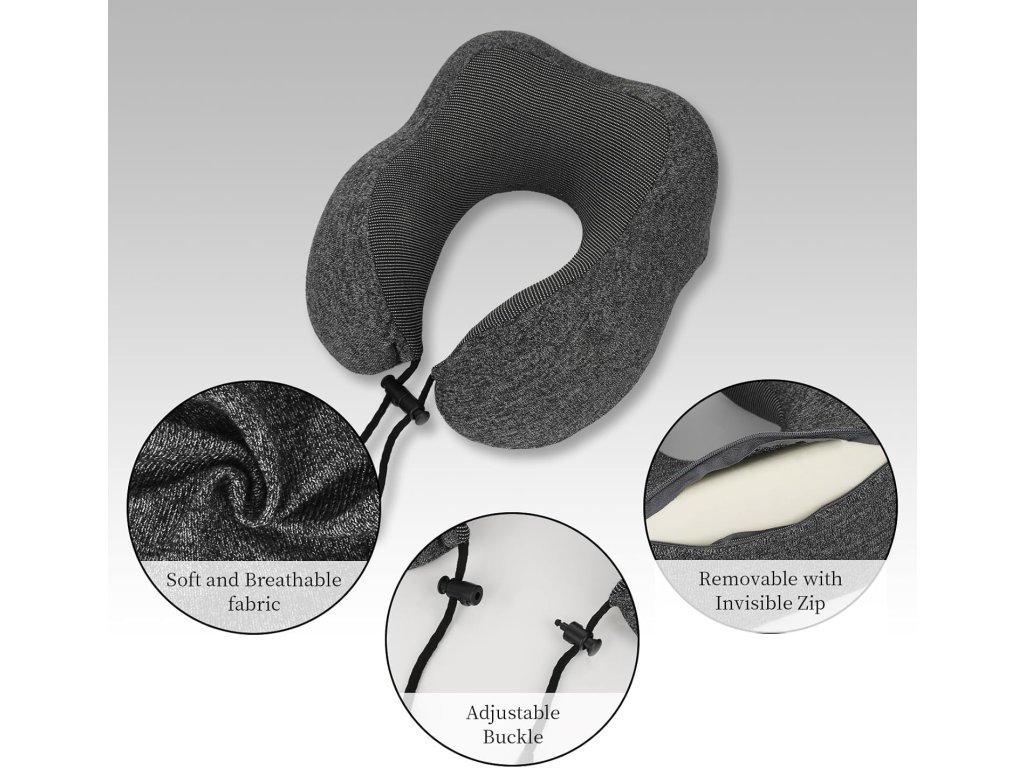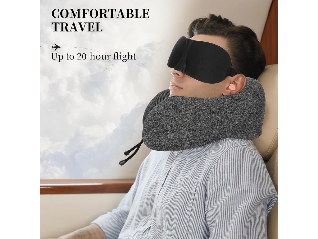 Cestovní polštář na podporu šíje z paměťové pěny + Bonus oční maska a špunty do uší