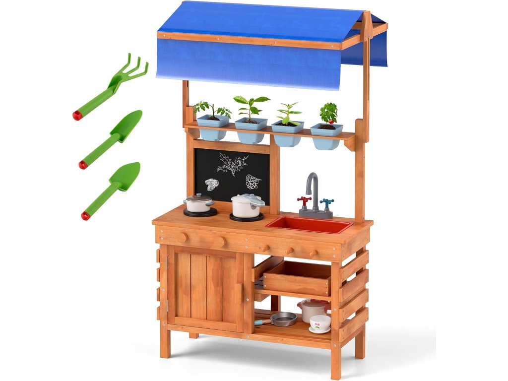 - Tato outdoorová kuchyňská hrací sada nabízí univerzální dřez pro vodu nebo hru s pískem. Deska podporuje kreativitu, sporák a trouba nabízejí realistický zážitek z vaření. Háčky a police zajišťují pořádek a snadný přístup k předmětům.