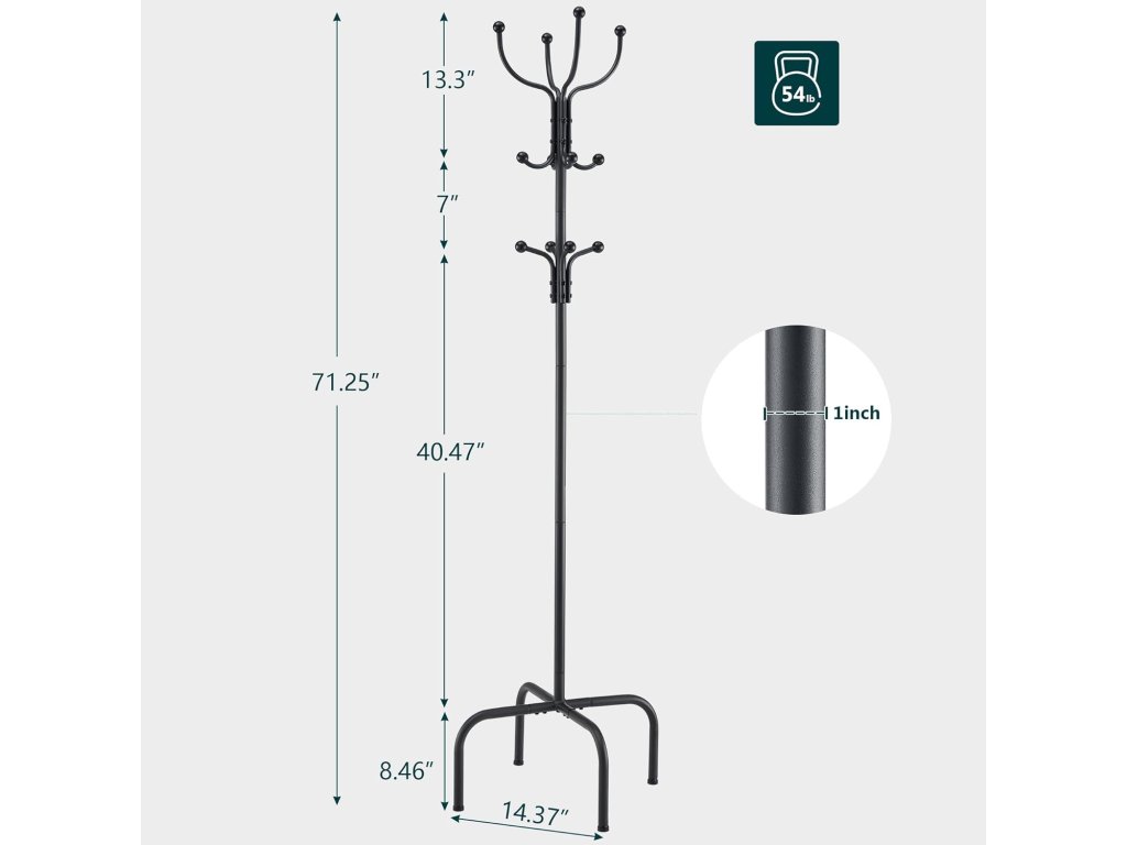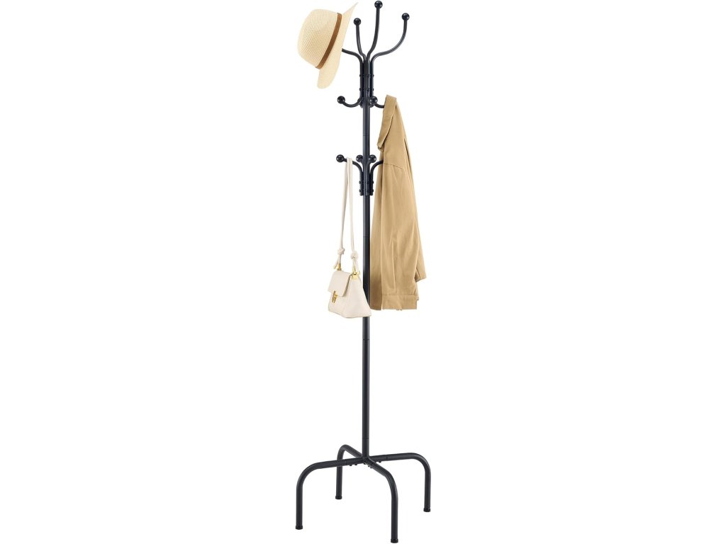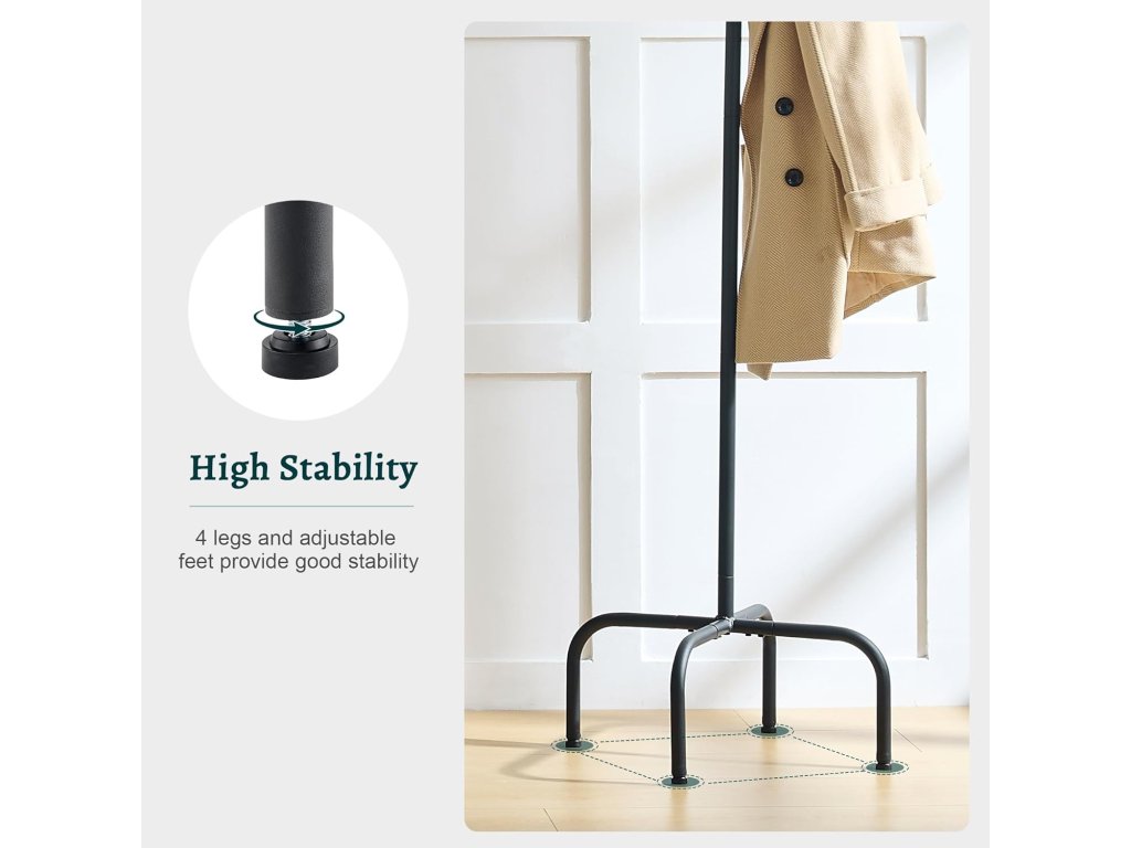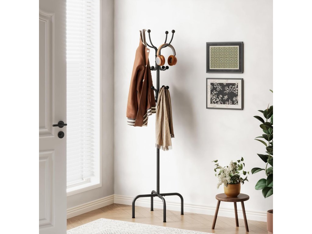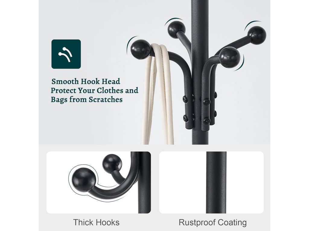 - Menší plocha v kombinaci s 12 háčky šetří spoustu místa. Velikost ramínek činí 36,36,180 cm, takže je snadné umístit do každého rohu, chodby nebo malé místnosti. Přiměřené háčky na klobouky, bundy, obleky, sukně, šály a jiné oblečení.
