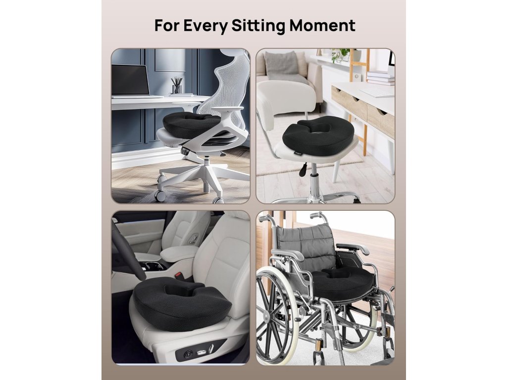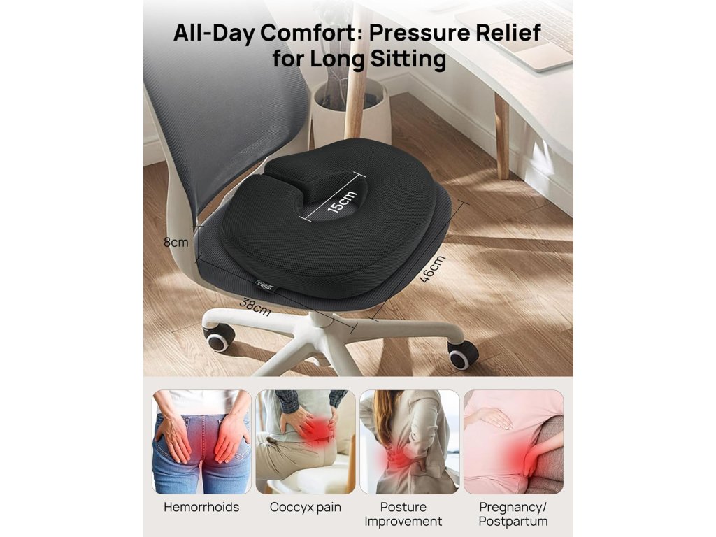 - S 46 x 38 x 8 cm se tento sedací polštář hodí k kancelářské židli / auto/invalidnímu vozíku. Integrovaná rukojeť umožňuje snadnou přepravu doma, na jógu, cestování nebo do práce – ideální pro řidiče, administrativní pracovníky a osoby v pooperačním odpočinku.