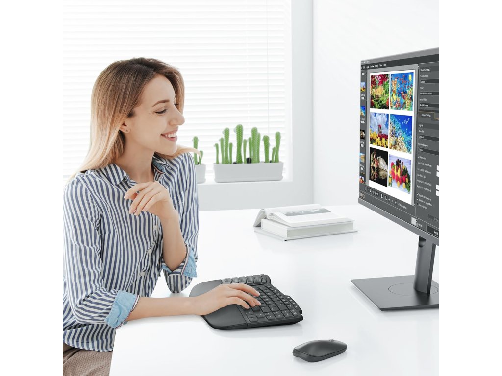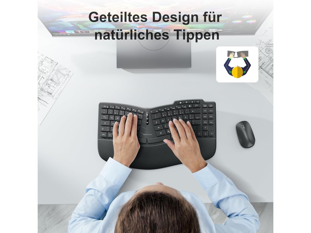 - Bezdrátová klávesnice 2,4G: Dělená bezdrátová klávesnice nabízí stabilní bezdrátové spojení v dosahu 10 metrů pro použití s počítači, stolními počítači a notebooky. Upozornění: USB přijímač se nachází na zadní straně klávesnice.