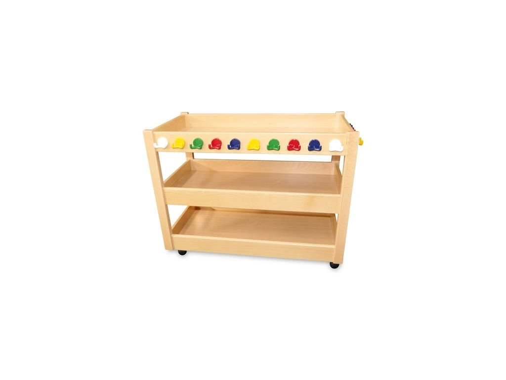 Masivní bukový vozík na kolečkách pro snadnou manipulaci, každé dítě má k dispozici dvojháček.