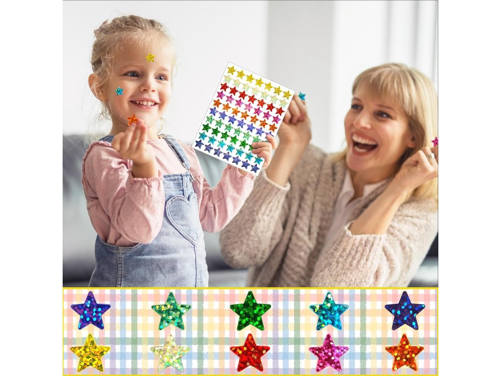 - Třpytivé nálepky se hodí k odměně dobrého chování. Pokud školák udělá něco vynikajícího, mohou učitel a rodiče nalepit třpytky na obličej a oblečení a podpořit tak pozitivní potenciál žáka. Nálepky s odměnami jsou perfektní pro narozeniny, večírky a jiné příležitosti, můžete je nalepit na své oblečení, obličej, abyste získali pozornost, nálepka hvězda vás bude středem pozornosti.