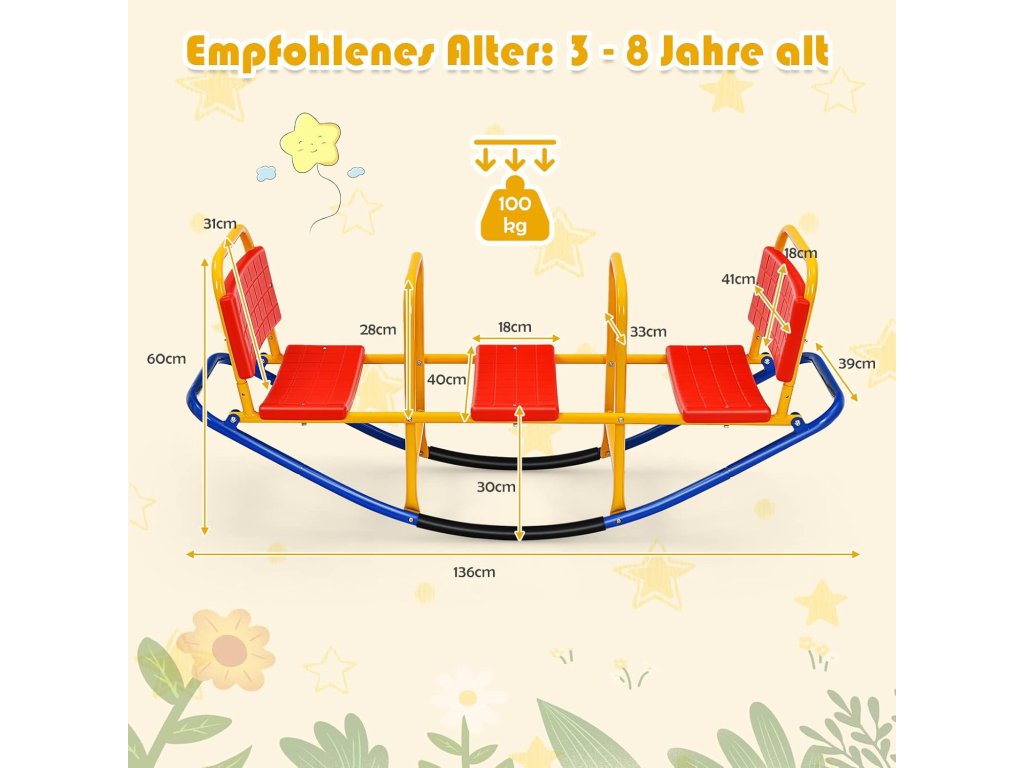 - Díky robustnímu ocelovému rámu má kolébka velmi dlouhou životnost. Může unést až 100 kg a hodí se proto dobře pro více dětí ve věku od 3 do 8 let.